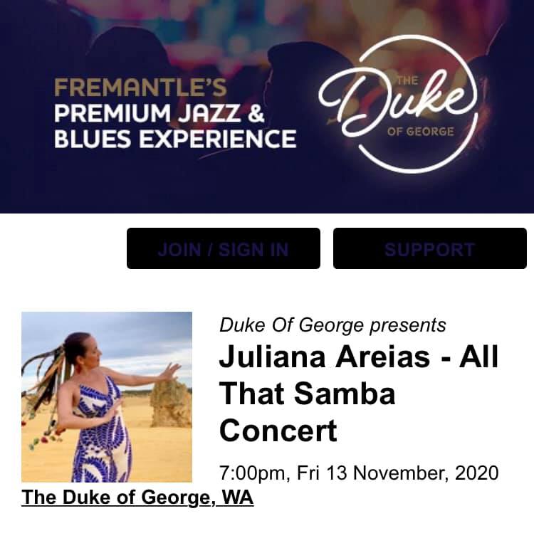 FREMANTLE – Fri 13 Nov – Juliana Areias All that Samba Concert @ Duke of George . First performance at Fremantle’s premium Jazz & blues venue –BOOK NOW