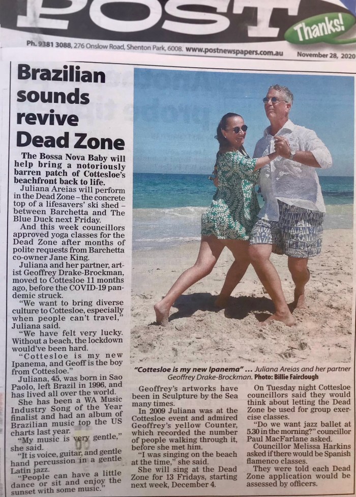 “It has been my dream to sing gentle bossa nova and bring a bit of the Copacabana 60’s atmosphere to North Cottesloe. North Cottesloe is my favourite beach in Perth – I have visited it for many years and now I walk along it every day. I think these performances will have a special meaning this particular summer holiday season when, due to Covid risks and restrictions, we are not encouraged to travel outside Western Australia. I am so looking forward to sharing my passion, making people feel on holiday without travelling and helping us to appreciate and celebrate even more this extraordinary city we live in. North Cottesloe in many ways is more beautiful than iconic beaches such as Malibu, Bondi, Copacabana and Ipanema. I hope our Sunset Songs will contribute to enhance this perception”.