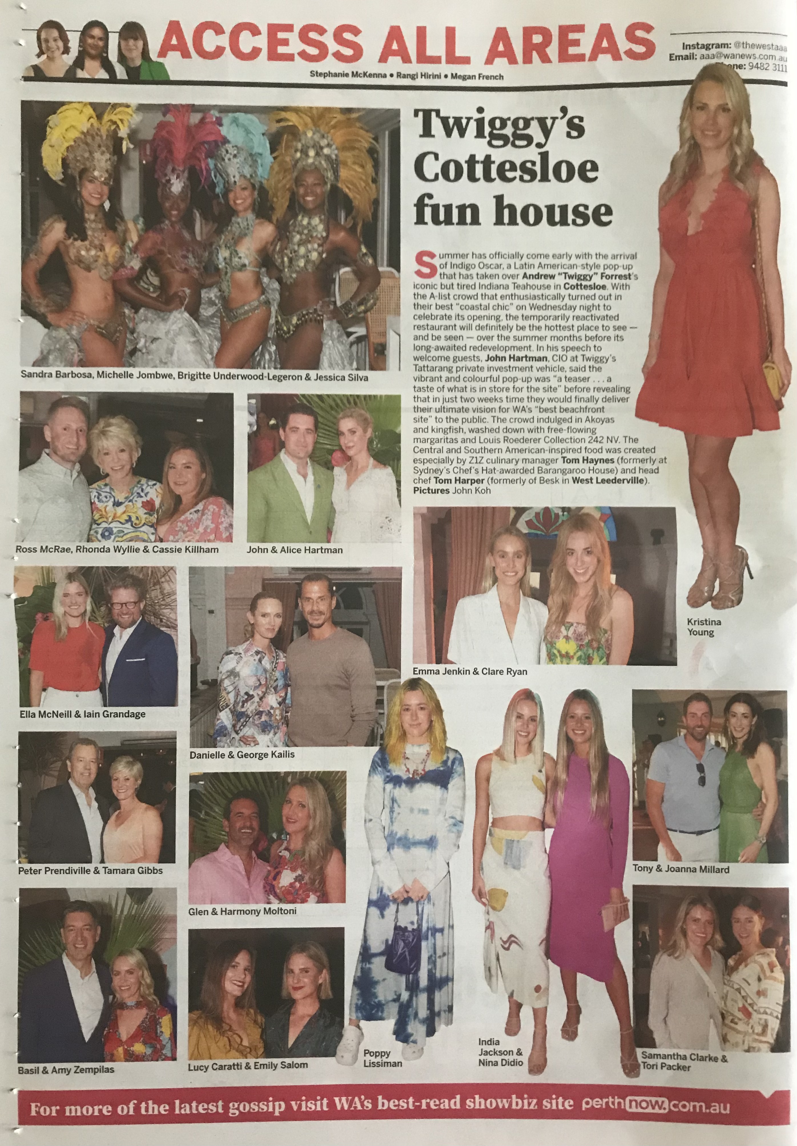 Brazilian singer Juliana Areias accompanied by her quartet and Sandance were the artists chosen to perform at the VIP Launch of Indigo Oscar – in Cottesloe, at the Indiana Tea House, the most iconic beachfront and postcard of Perth. This spot that used to be the dancing ballroom of Perth’s Society in the 1930’s is back and full of life and glamour with the new colours, flavours and sounds of Brazil! Brazilian music and the beach – always the perfect combination! Check the photos and the West Australian article below.