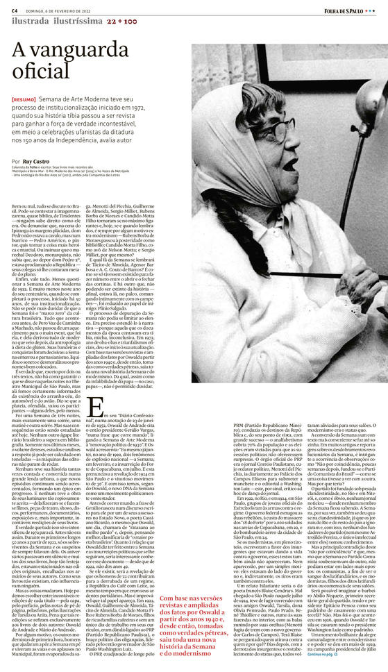 Ruy Castro special article “A vanguarda oficial” about the Centenary of the 1922 Modern Arts Week of Sao Paulo published at the Sao Paulo Newspaper “Folha de São Paulo” on 7 February 2022, Juliana Areias’s birthday.
