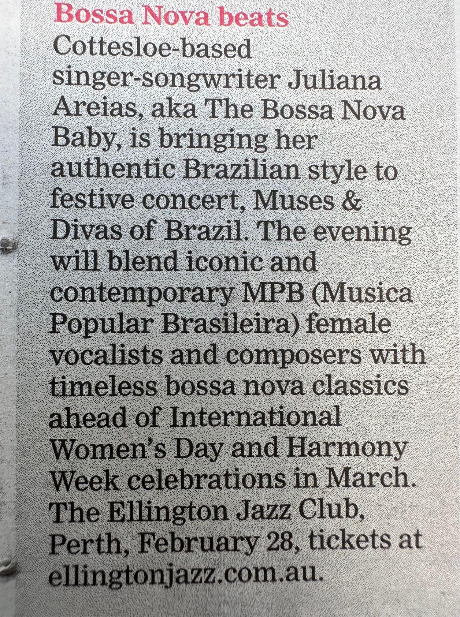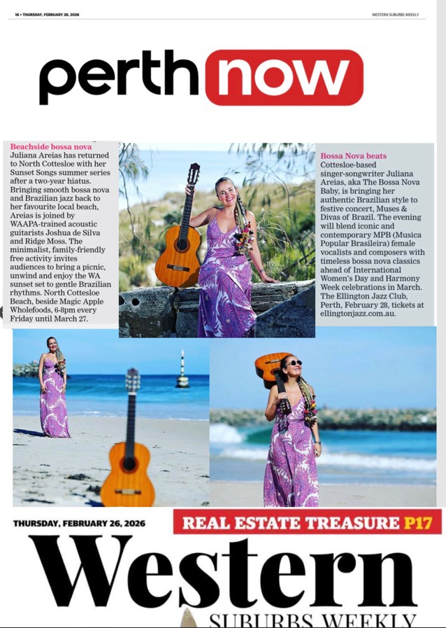 - PERTH NOW – Western Suburbs Weekly Newspaper – Don’t Miss session – by Tanya MacNaughton about Juliana Areias – Muses & Divas of Brazil Concert – 26 Feb 2026