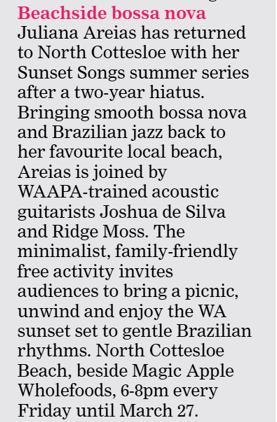 - The Post – Bossa Nova and the Beach – article about Juliana Areias – Sunset Songs Project – Perth, Australia, 26 Nov 2022.