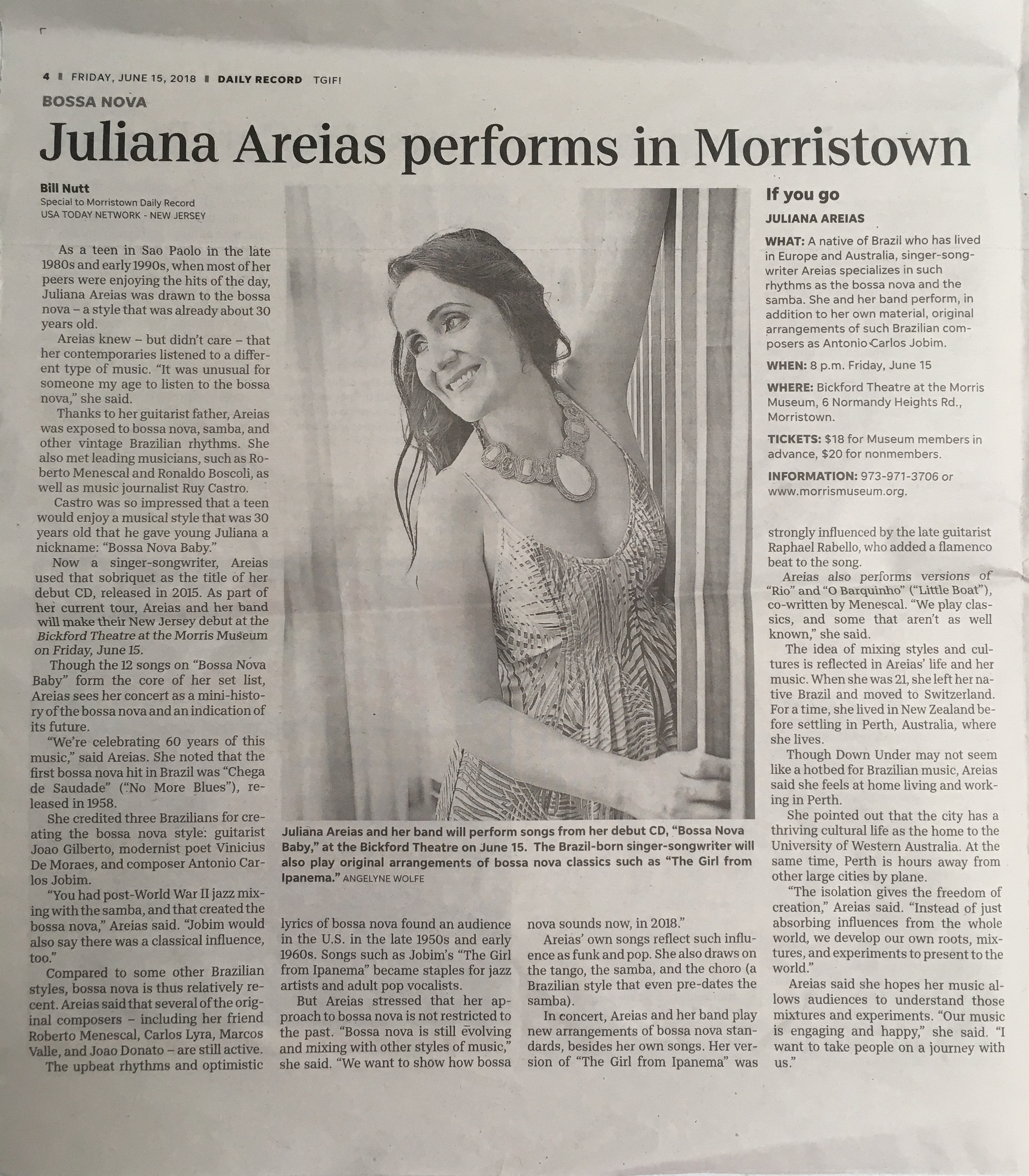 Article Printed Daily Record Bossa Nova Baby CD cover Juliana Areias performs in Morristown 15 June 2018 New Jersey NY Metropolitan Area USA