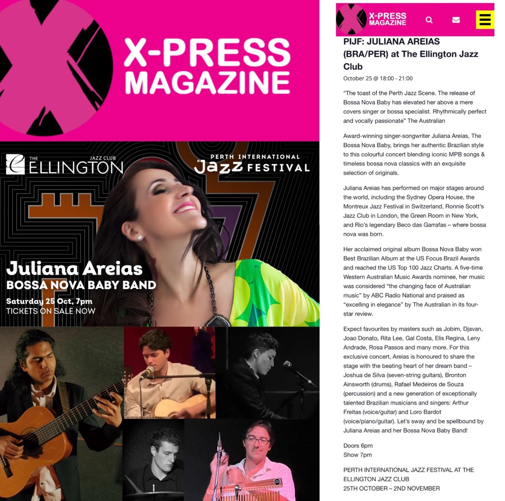We are looking forward to celebrating the very best of Brazilian Jazz at The Perth International Jazz Festival on Sat 25 October 2025 featuring Juliana Areias – Bossa Nova Baby Band at the Ellington Jazz Club – tickets on sale now. Full info and tickets at www.julianaareias.com