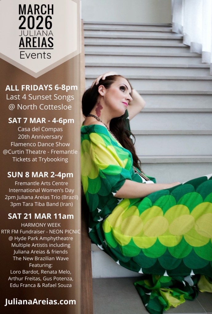 Award-winning singer-songwriter Juliana Areias,The Bossa Nova Baby, brings her authentic Brazilian style to this festive concert – blending iconic and contemporary MPB female vocalists and composers with timeless bossa nova classics –  in anticipation of International Women’s Day and Harmony Week celebrations.