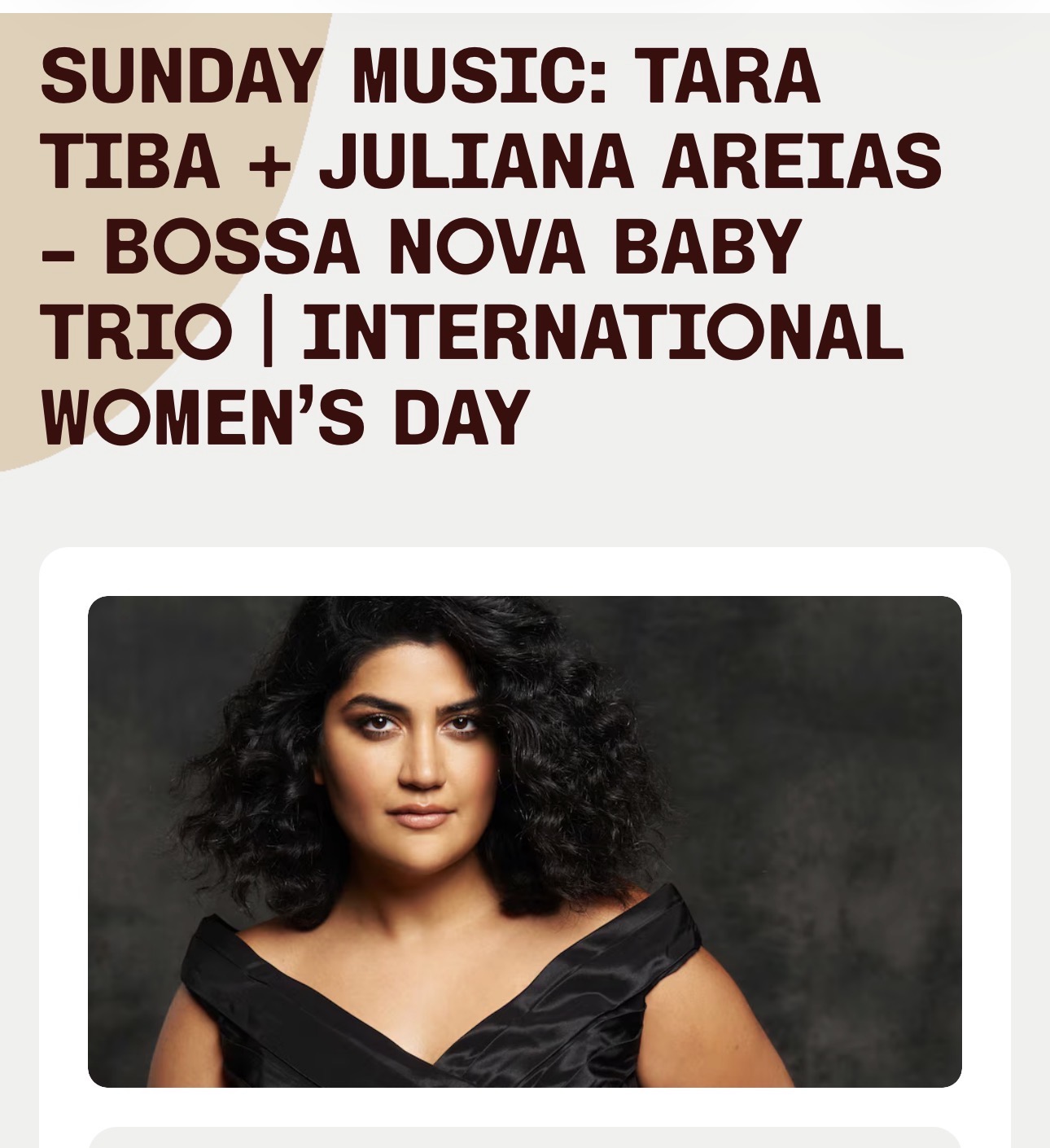 More information at: https://wfac.org.au/whats-on/post/sunday-music-tara-tiba-juliana-areias-bossa-nova-baby-trio-international-womens-day/