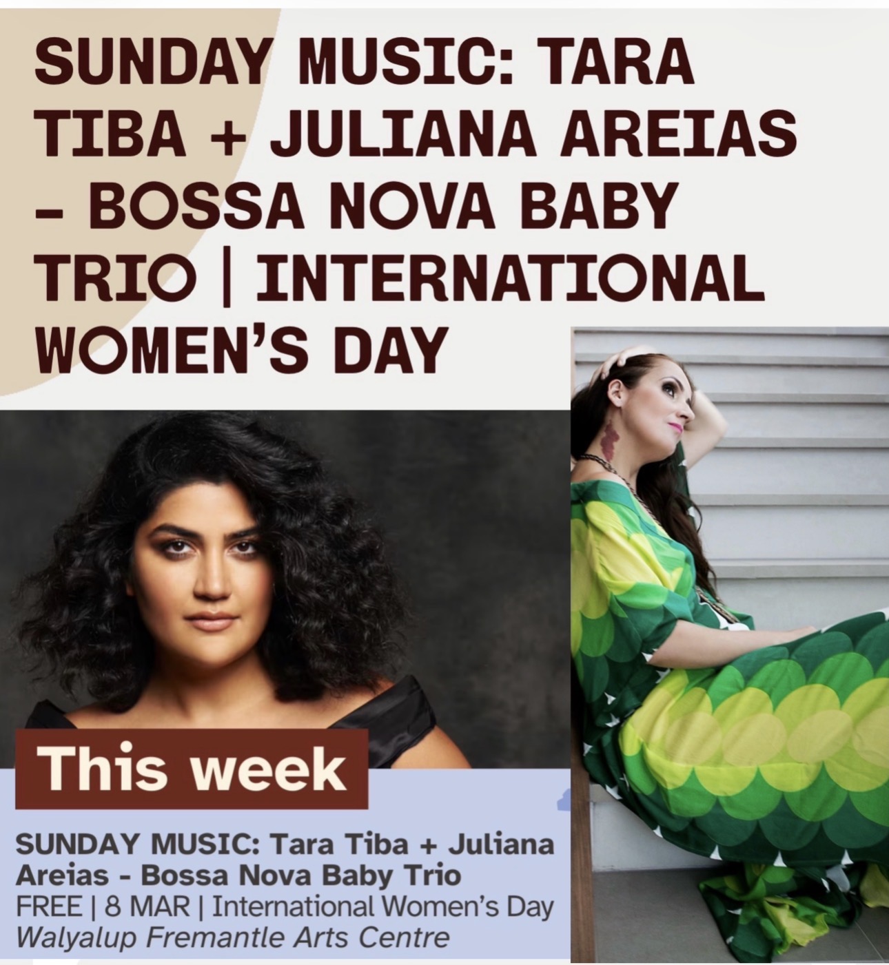 Sun 8 MAR – Women’s International Day celebration featuring Tara Tiba and Juliana Areias at Fremantle Arts Centre – 2-4pm – Free event.